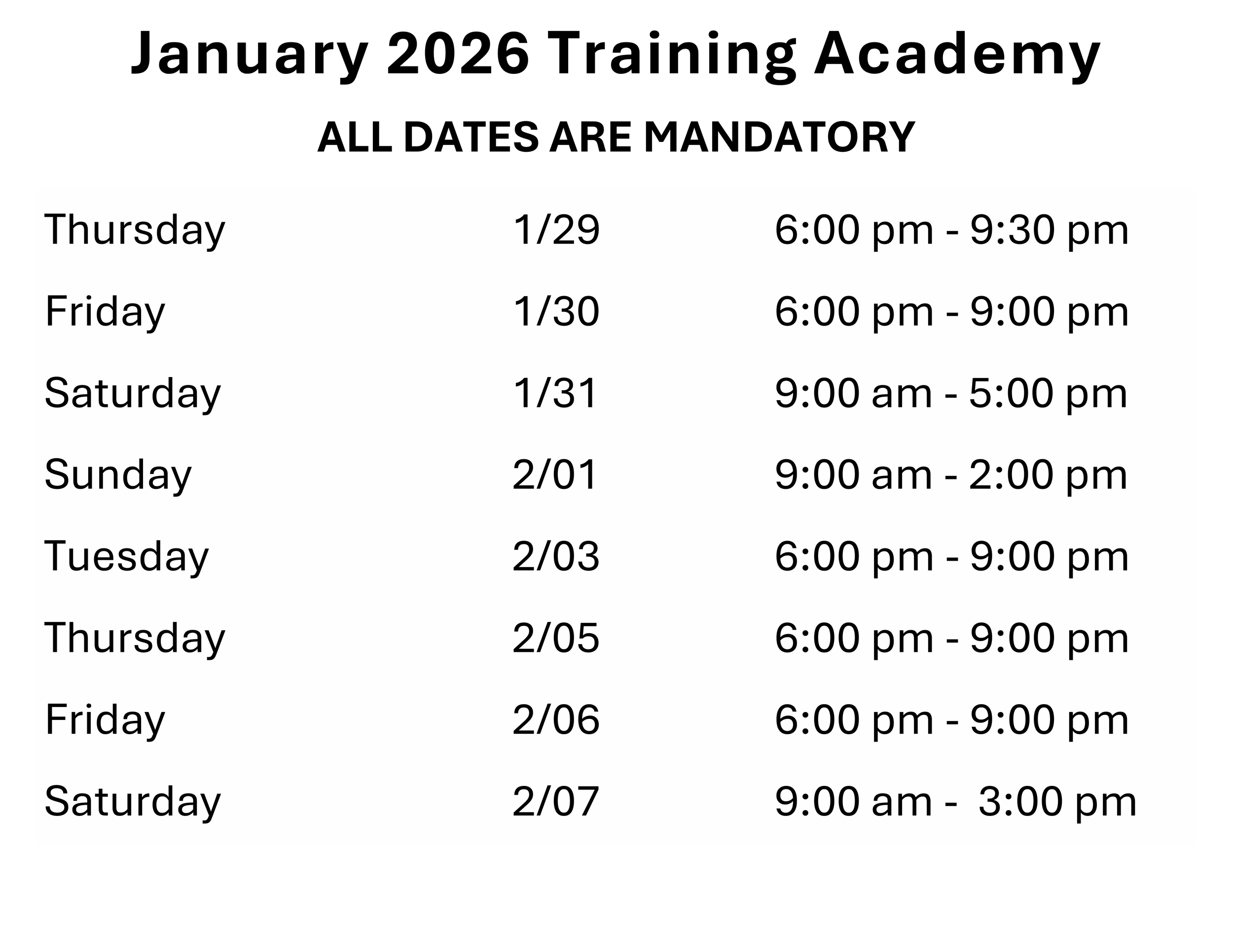 The Training Academy utilizes a variety of teaching methods including lecture, audio-visual, role playing, guest speakers, demonstrations, mentoring, and ride alongs .